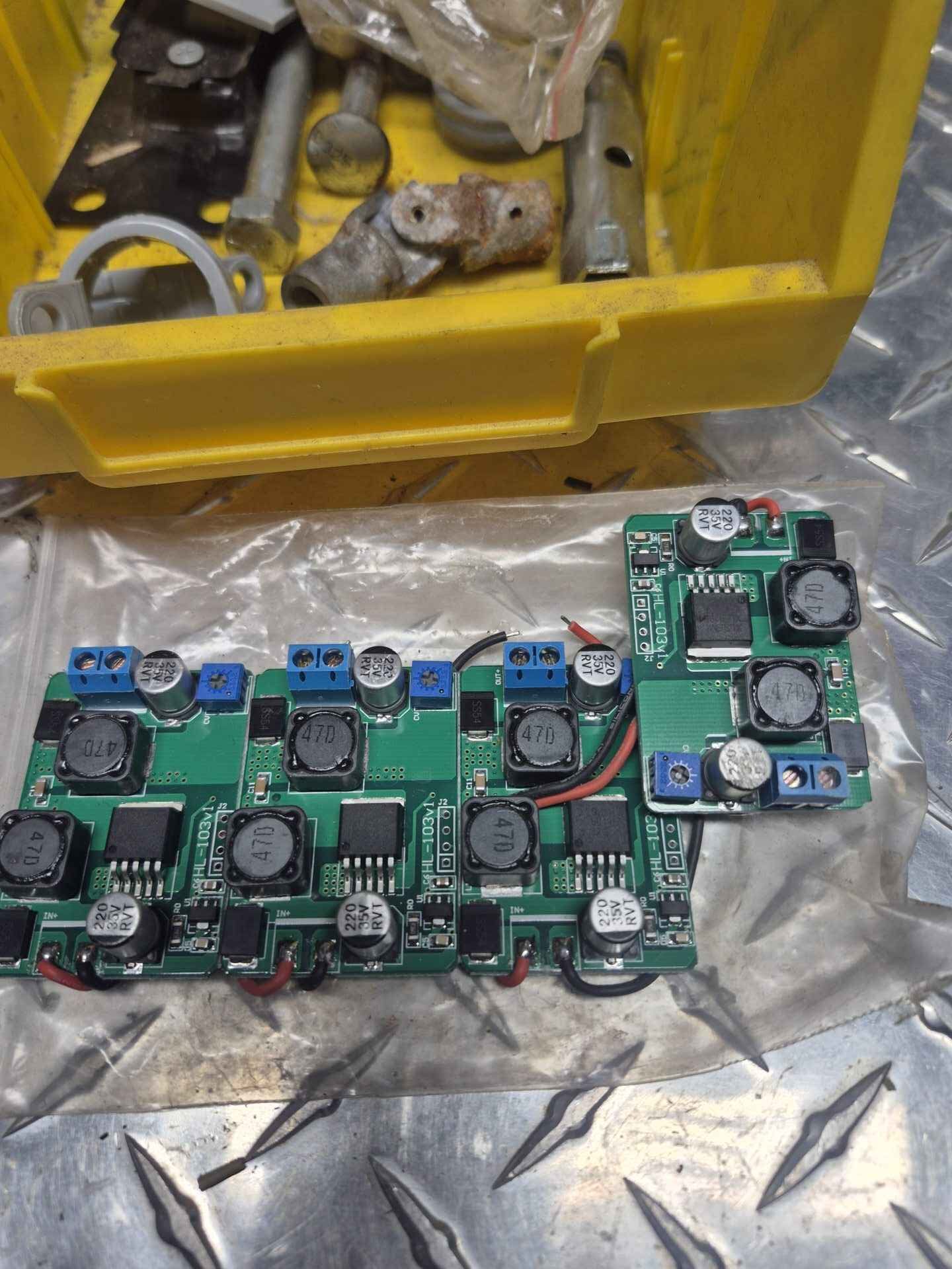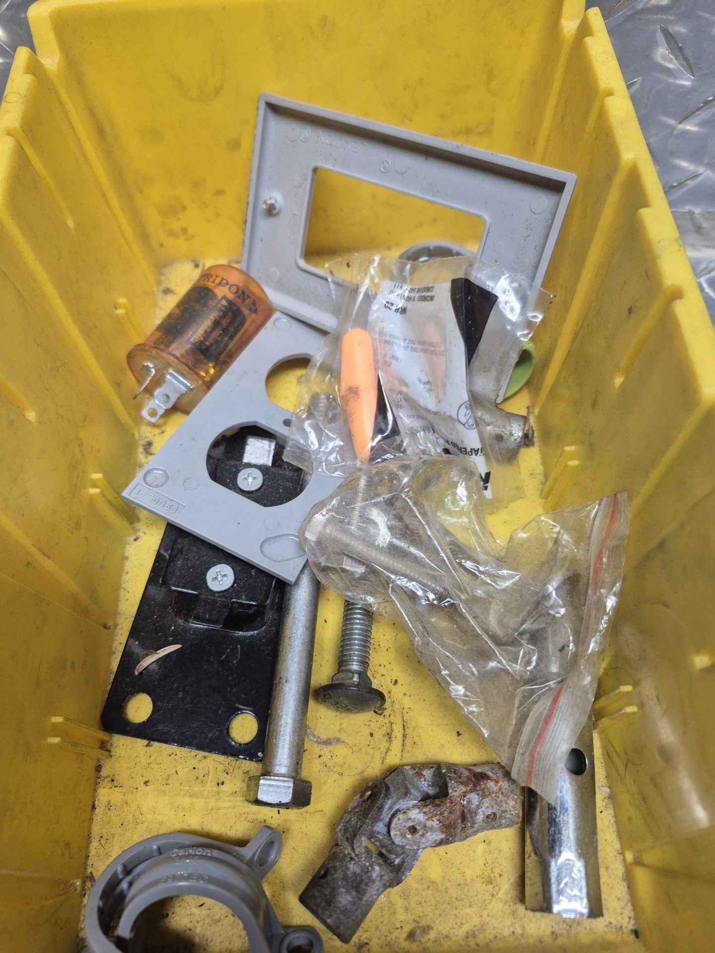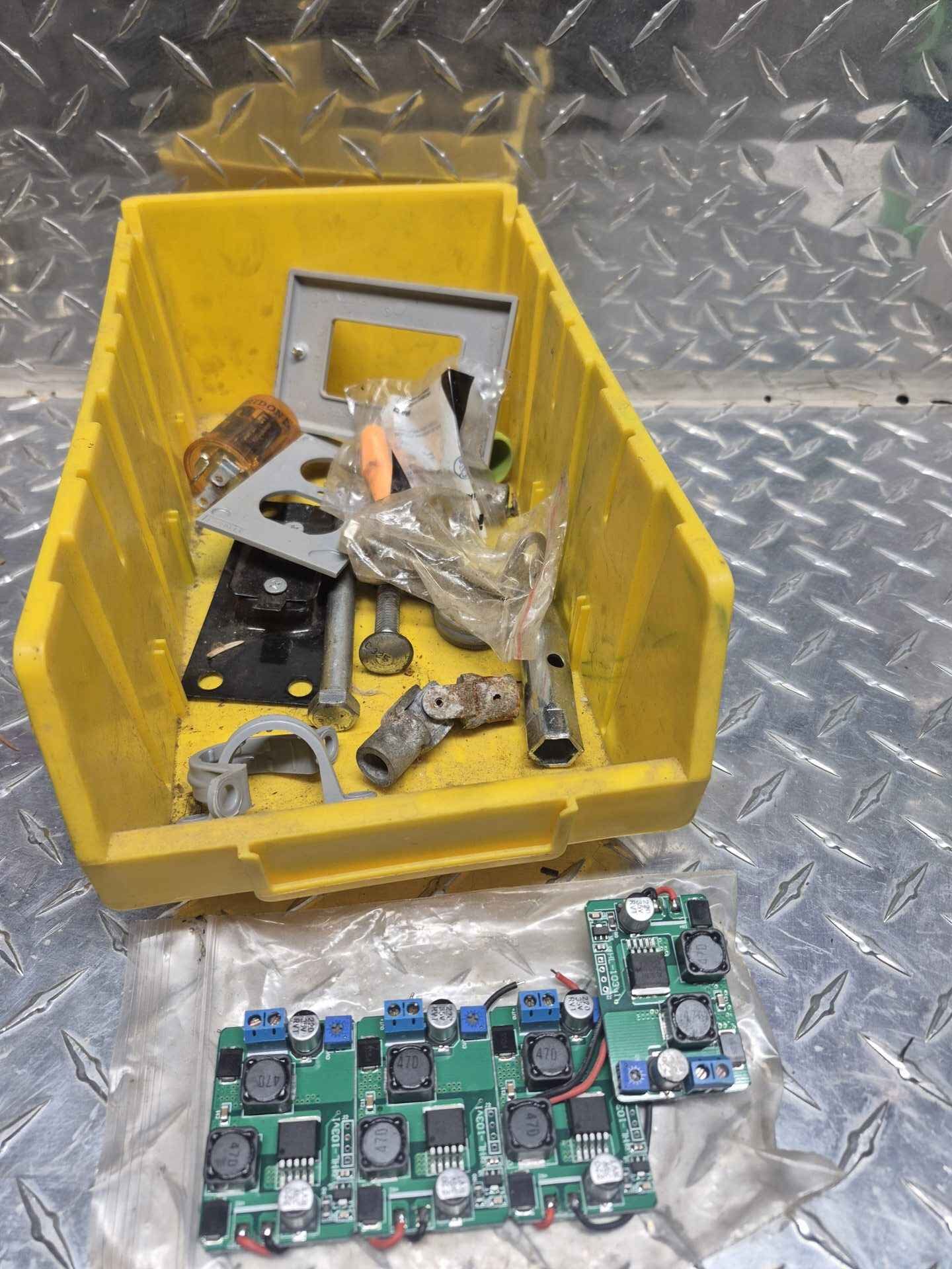 Circuit boards etc in large yellow parts bin