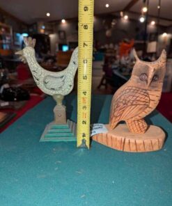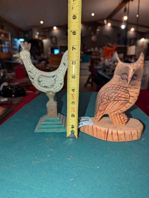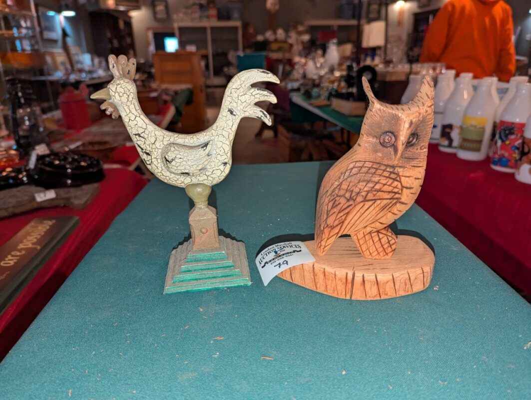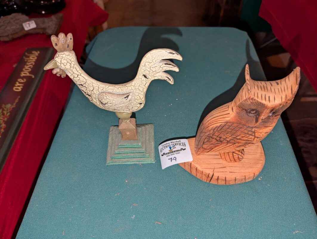 Crackle finish rooster and carved owl figures