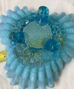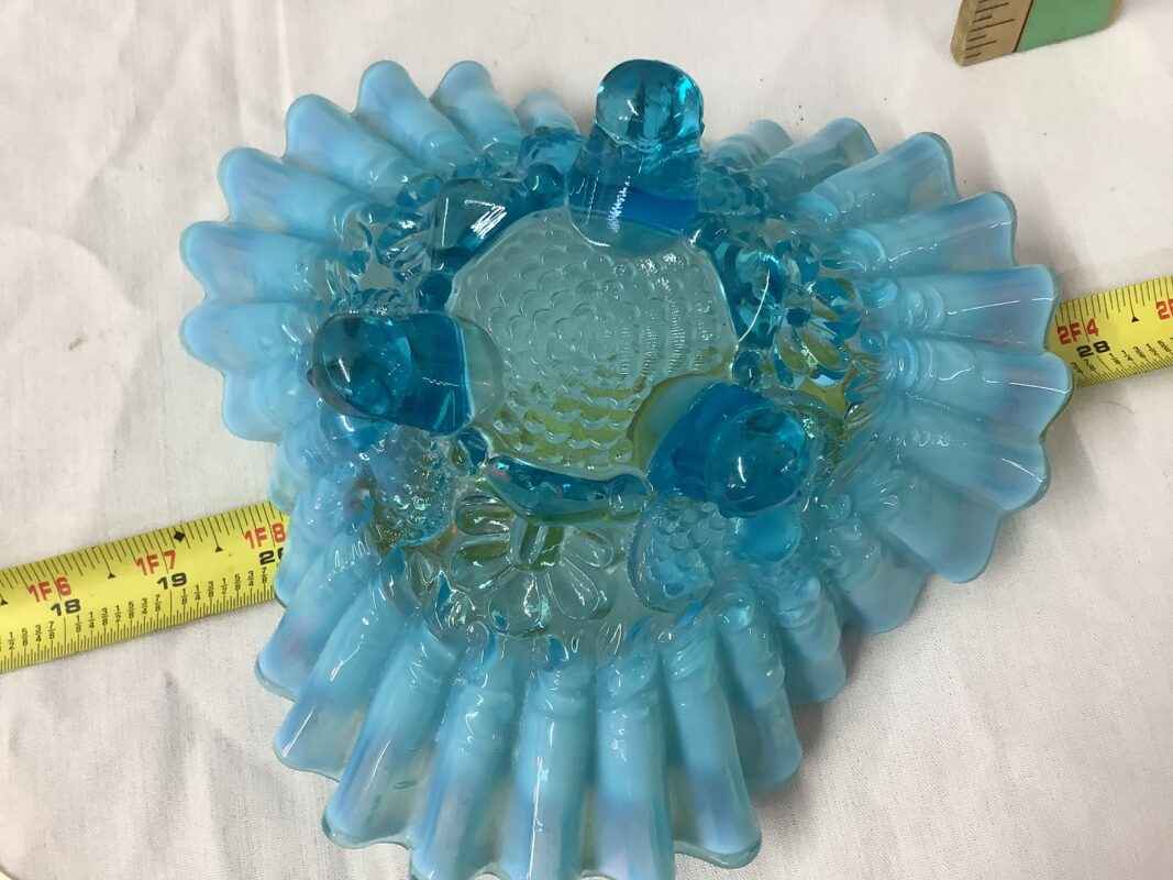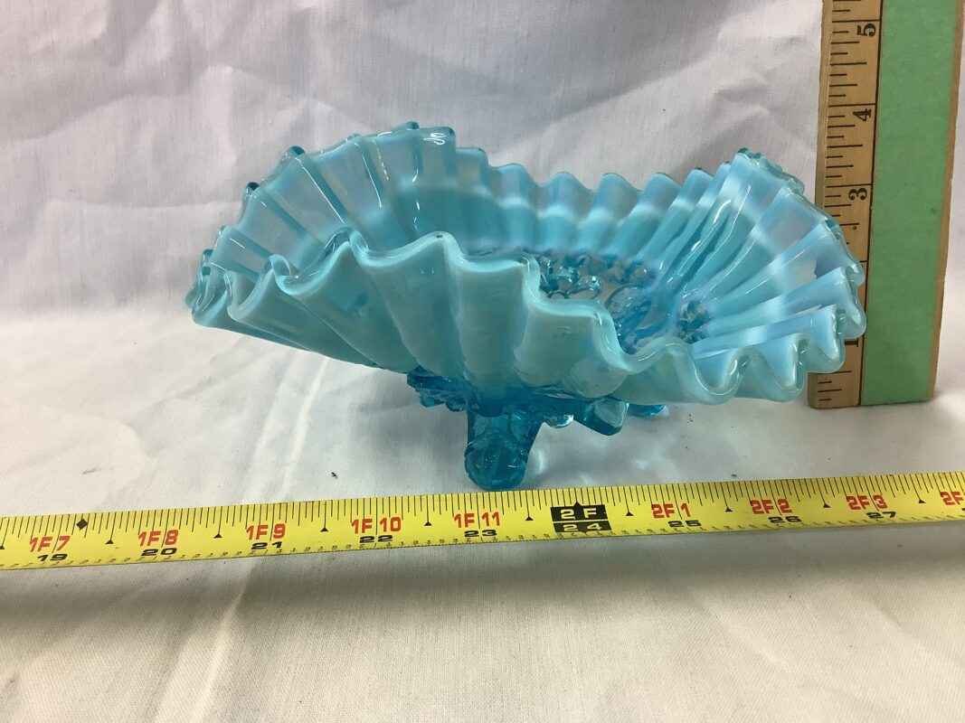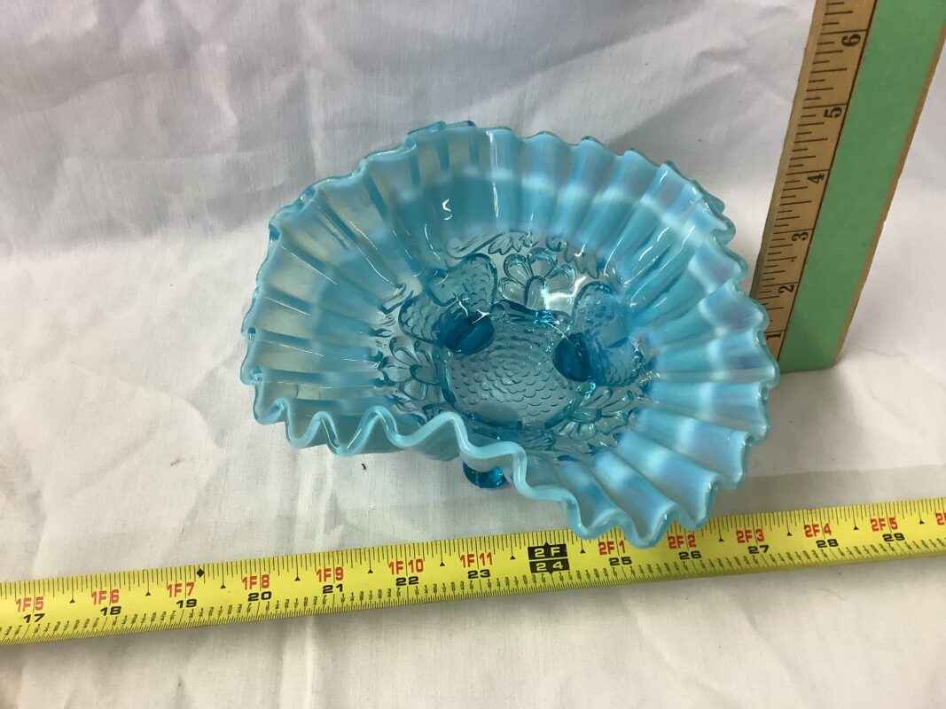 “Fenton” blue opalescent glass bowl, crimped, stands on 3 feet