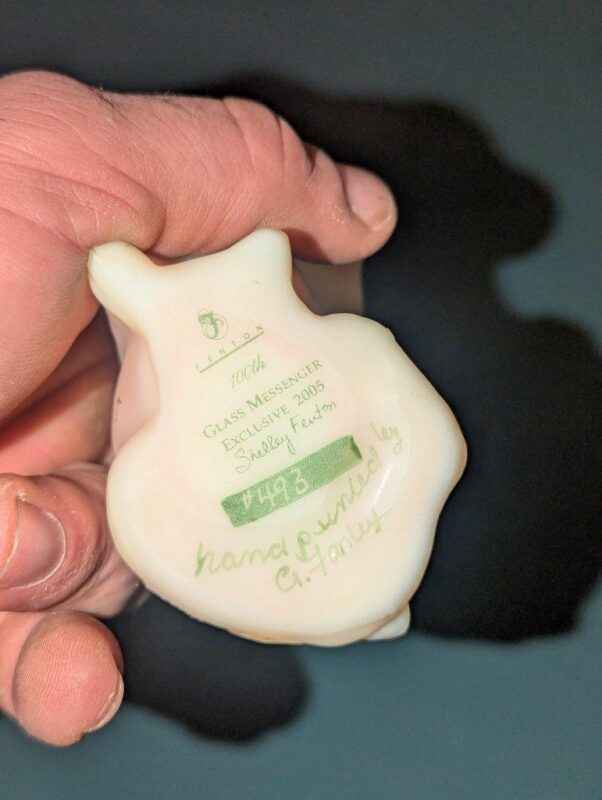 A rare item with its original stickers intact. 100th glass messenger exclusive with Shelley Fenton stamp/signature and hand painted by G. Fanley