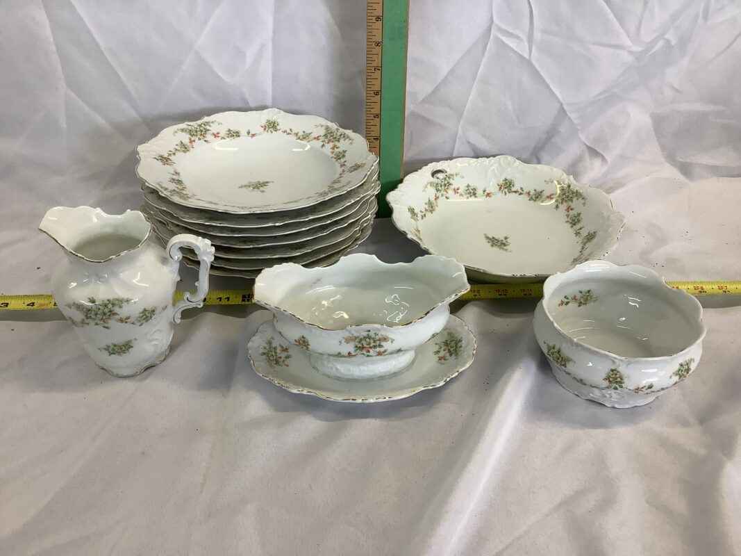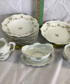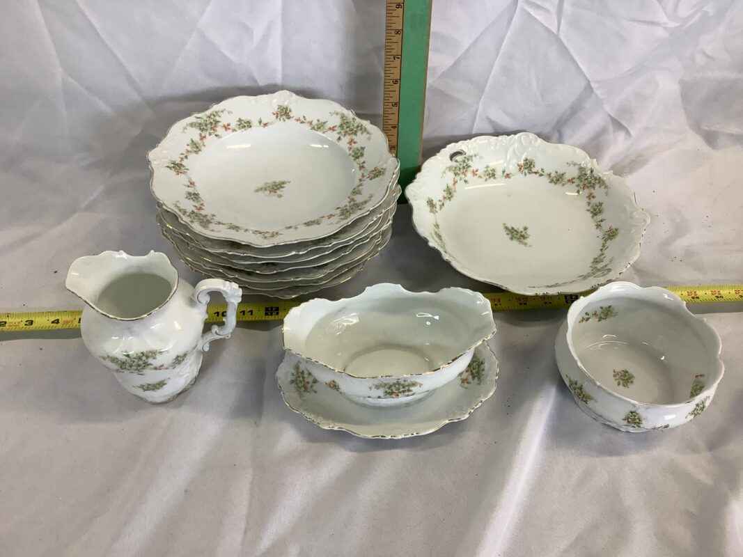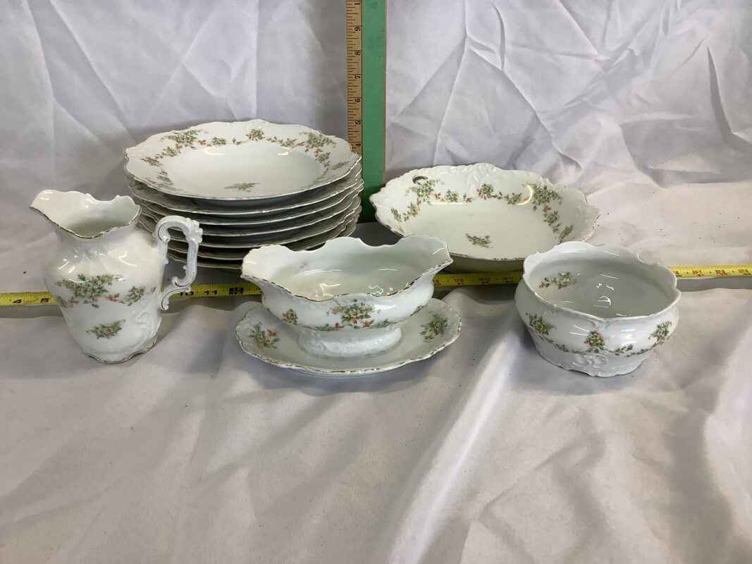 1 large salad bowl, 7 salad serving bowls, cream and sugar, gravy boat