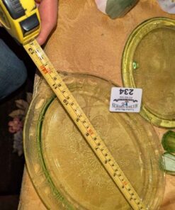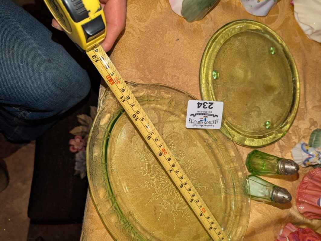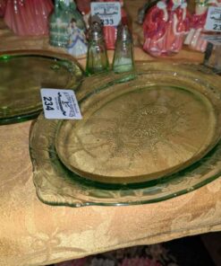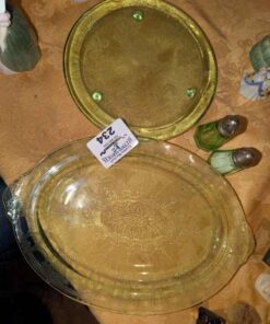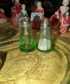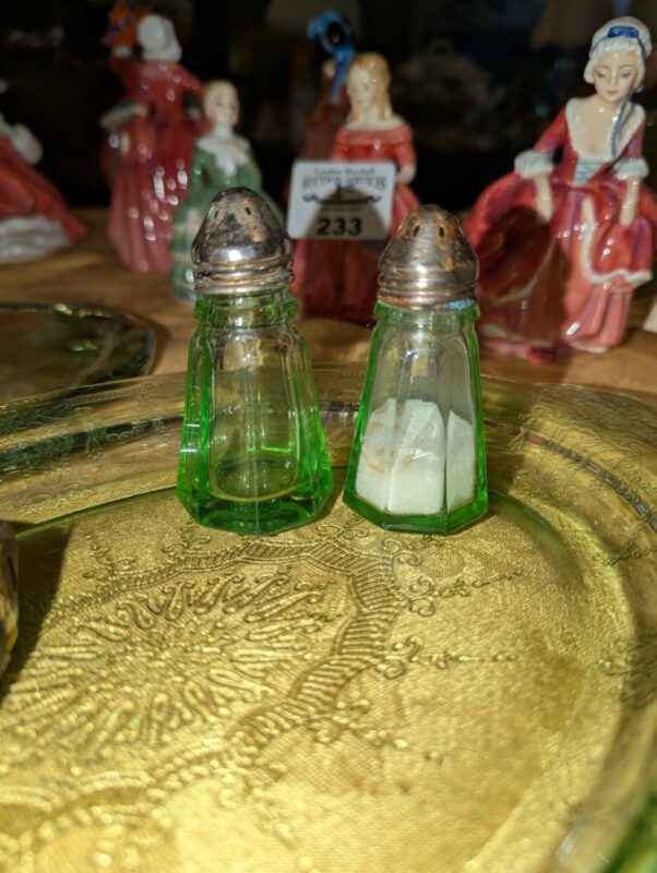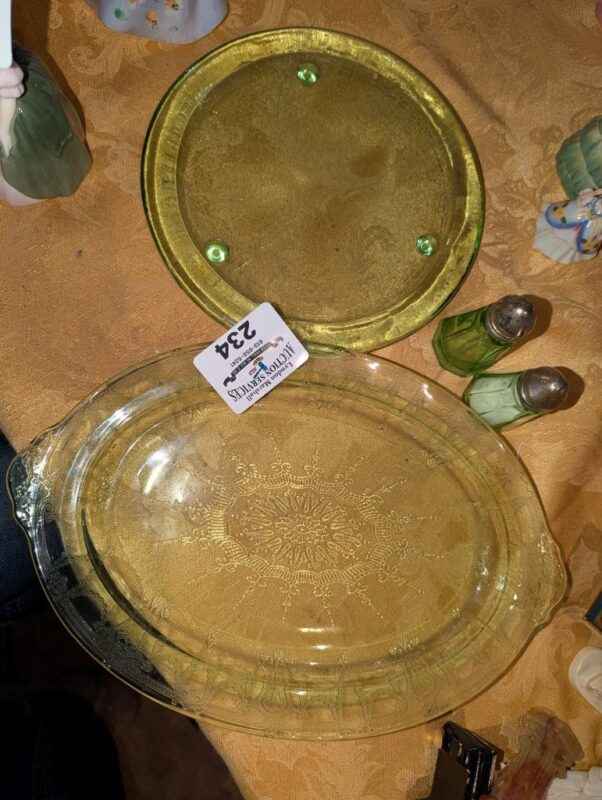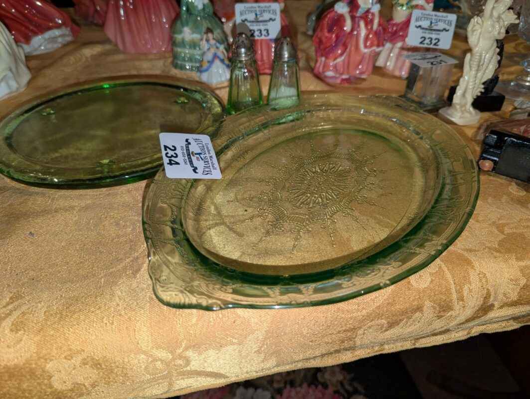 Green Depression Glass platters, salt and pepper shakers