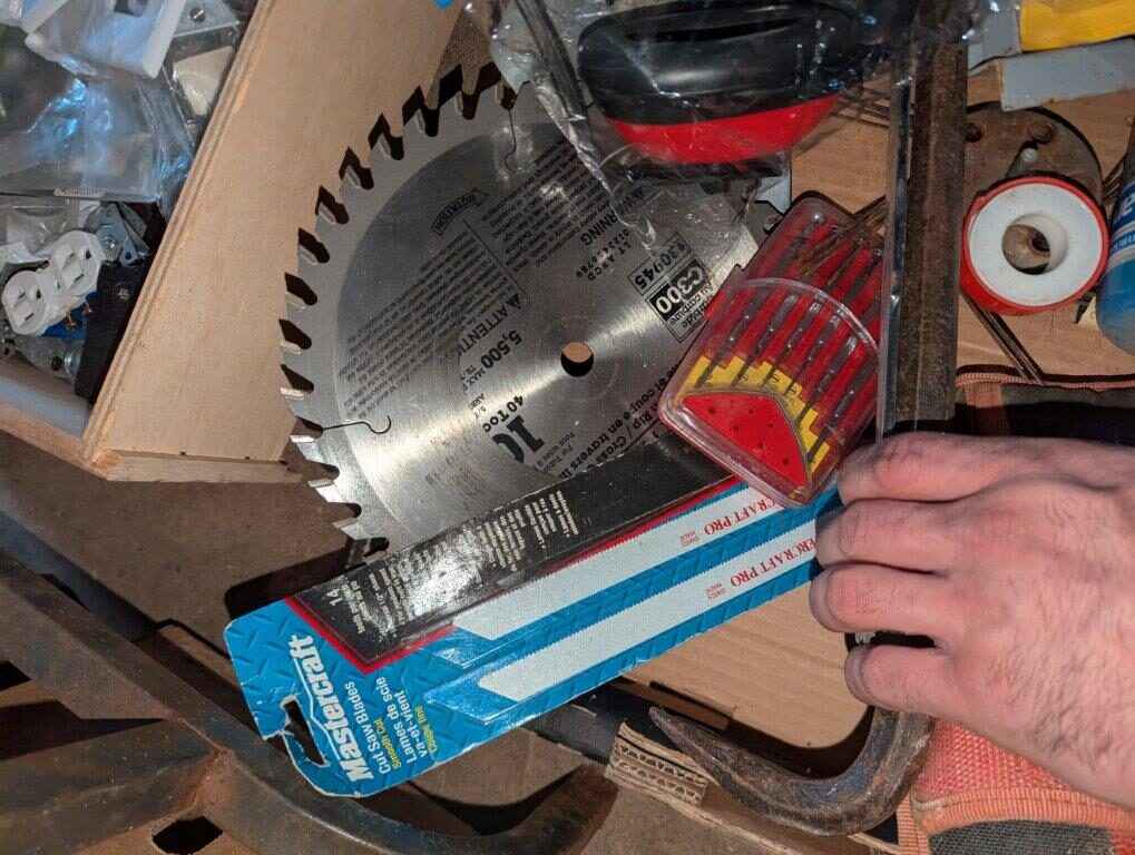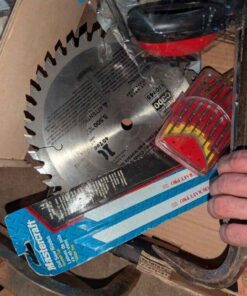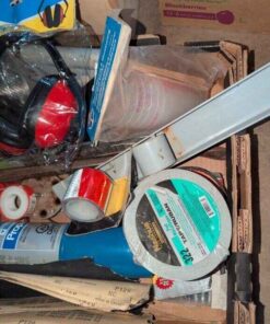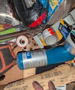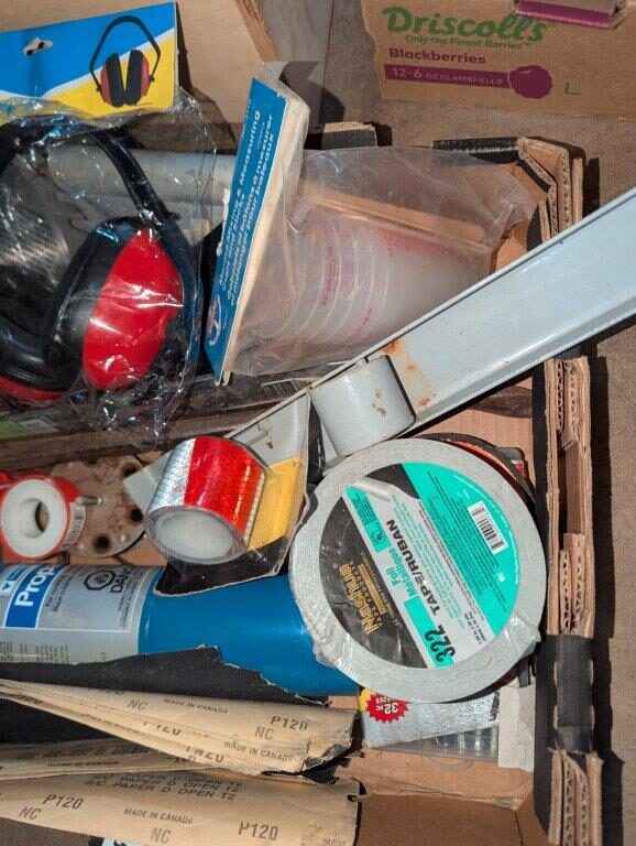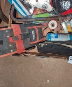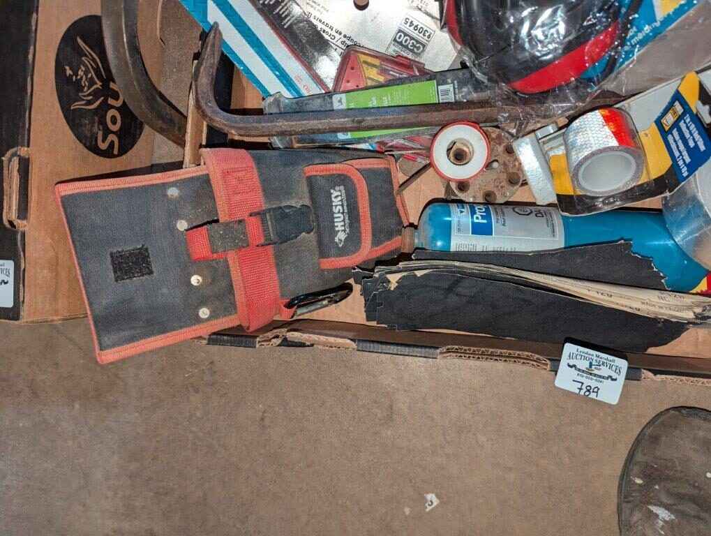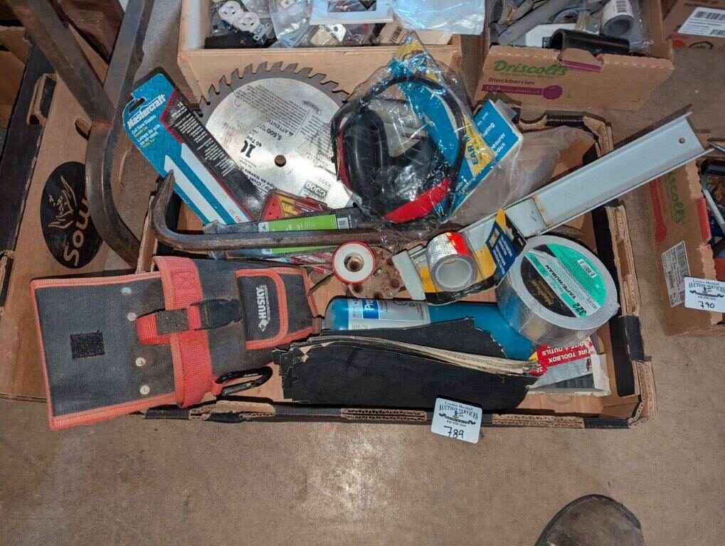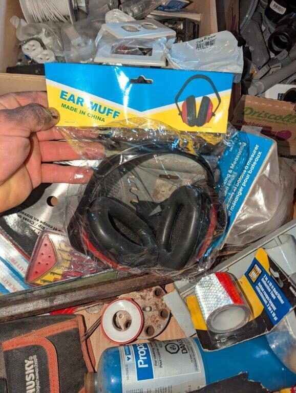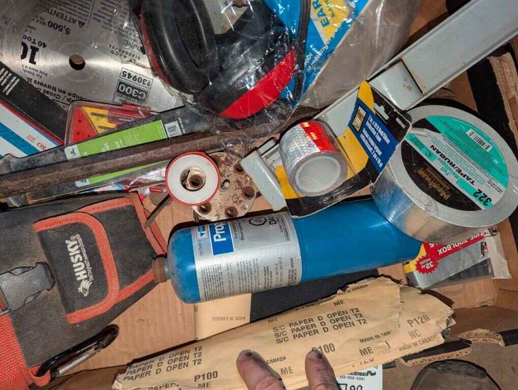 Husky tool pouch, Saw blade, ear protection, hand tools, Torch, etc