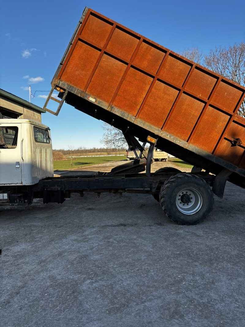 International Dump Truck Mechanical DT466 Workhorse; Equipped with High-Flotation Tires and Scissor Lift Hoist Location: Stirling Manufacturer: International Model: [Pending – Likely S-Series or 4900] Engine: 7.6L International DT466 Inline-6 Turbo Diesel