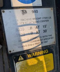 1998 Jcb 940 forklift with 30′ lift, side shift 8 foot forks, 2wd, 3465hr, 4cyl Perkins diesel, 8000lb capacity. Good running forklift