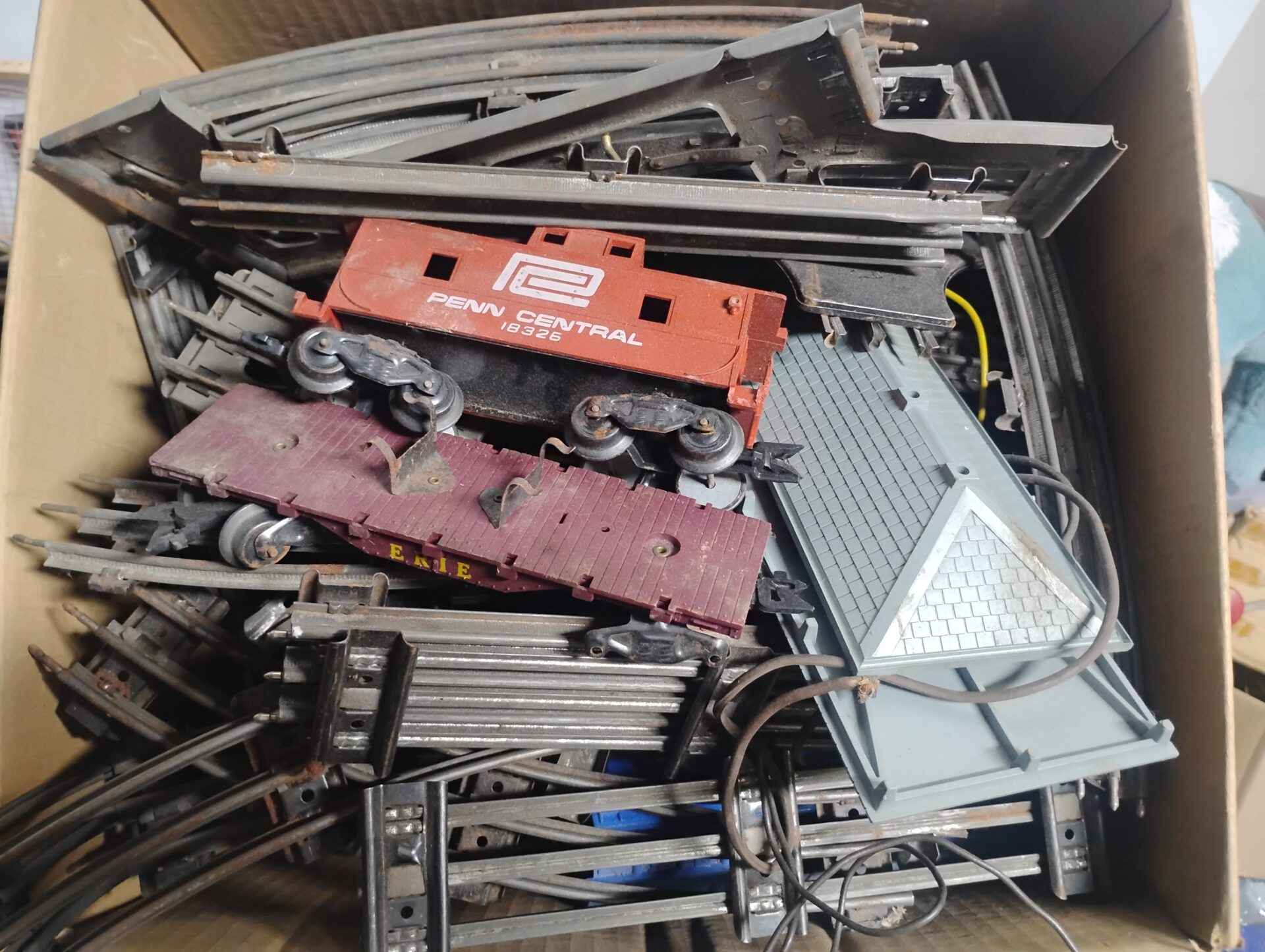 Large box of antique metal railway tracks and rail cars etc