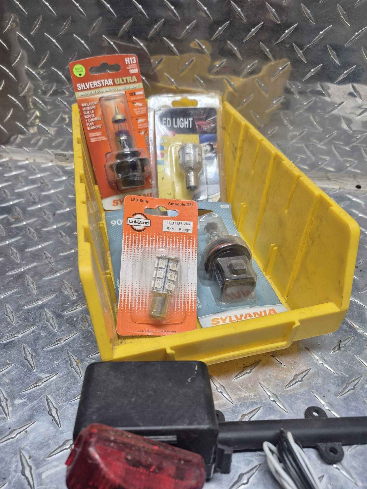 LED and headlight bulbs and large yellow parts bin
