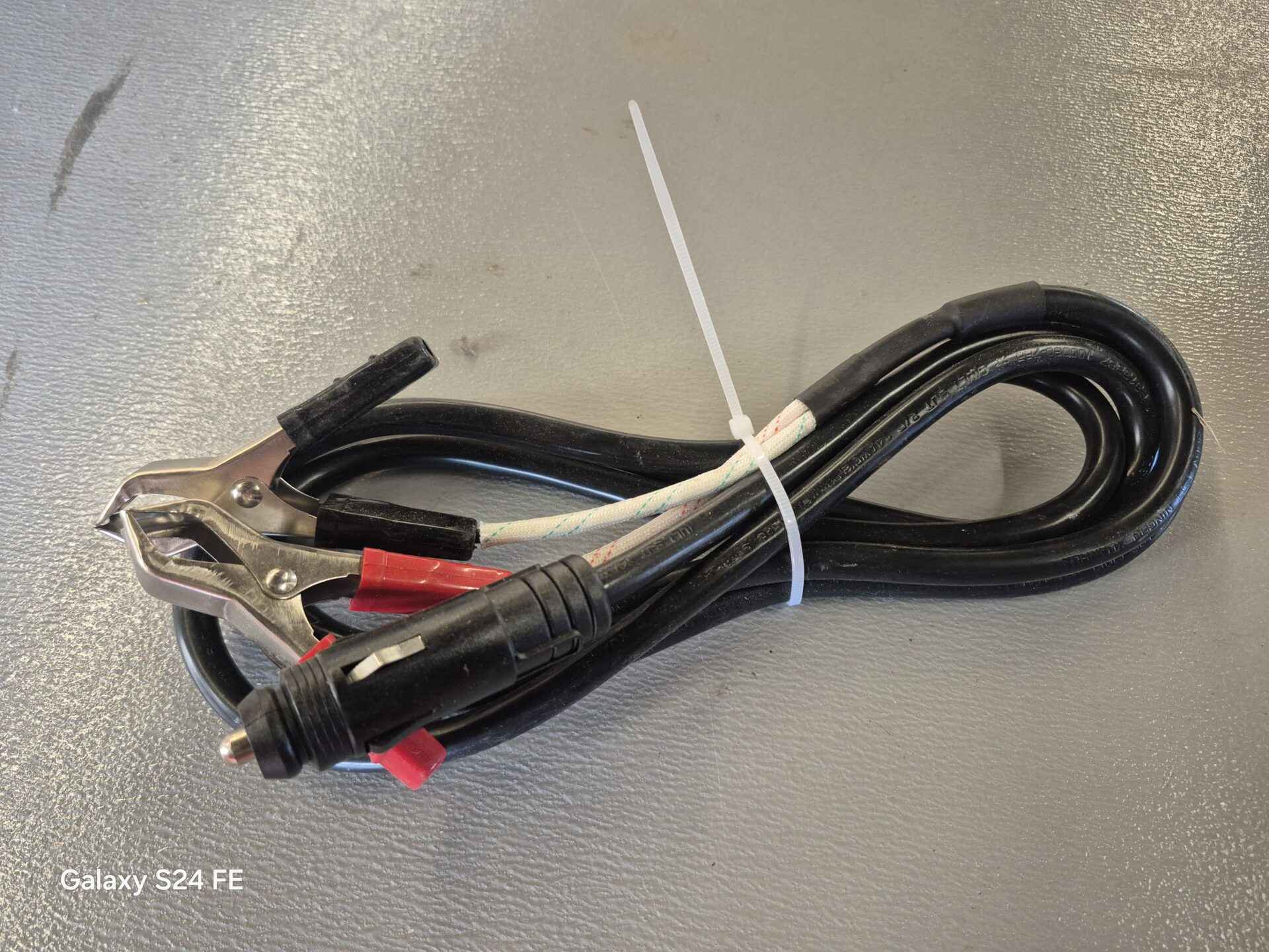 Male cigarette lighter plug with length of wire and clamps