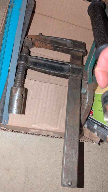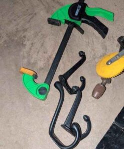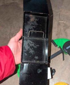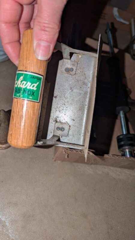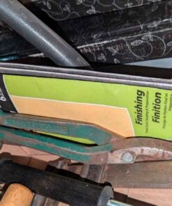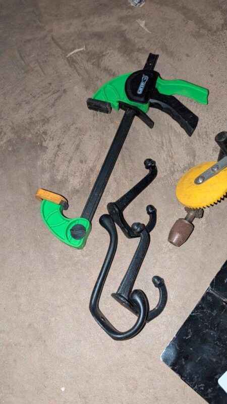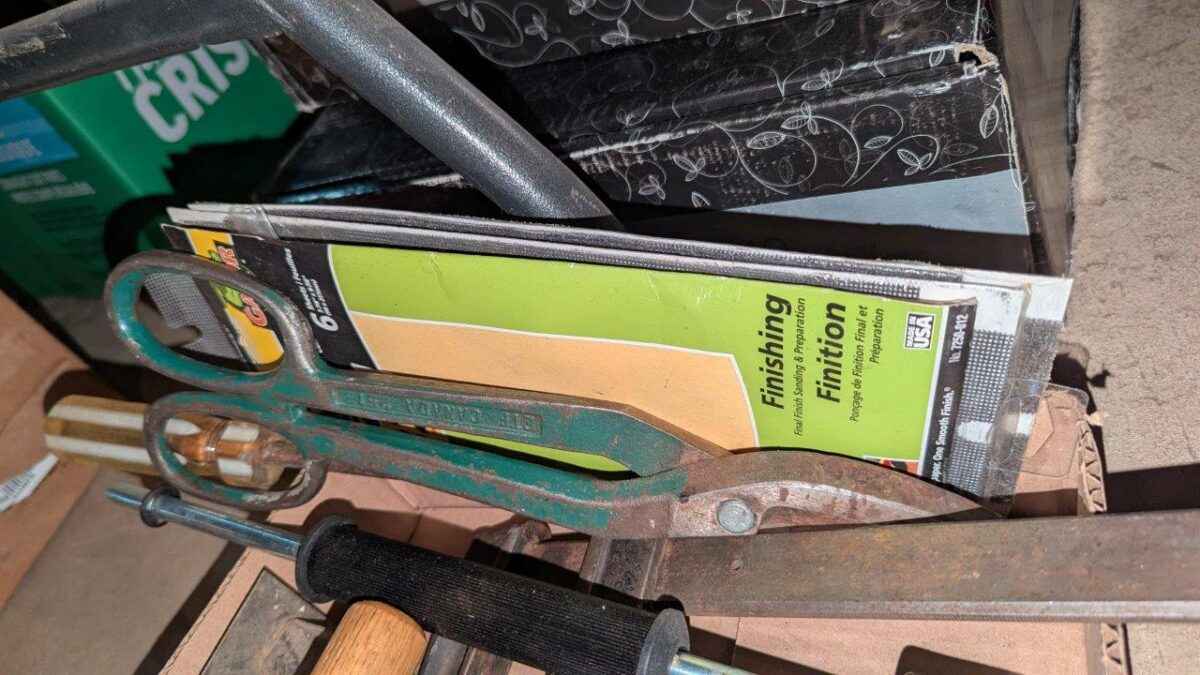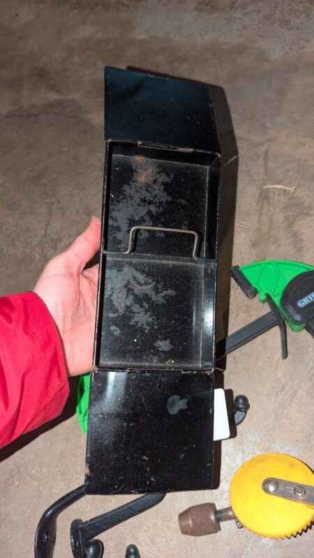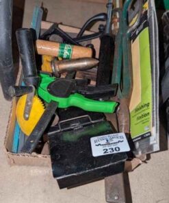 Metal box, hooks, hand tools, snips, etc