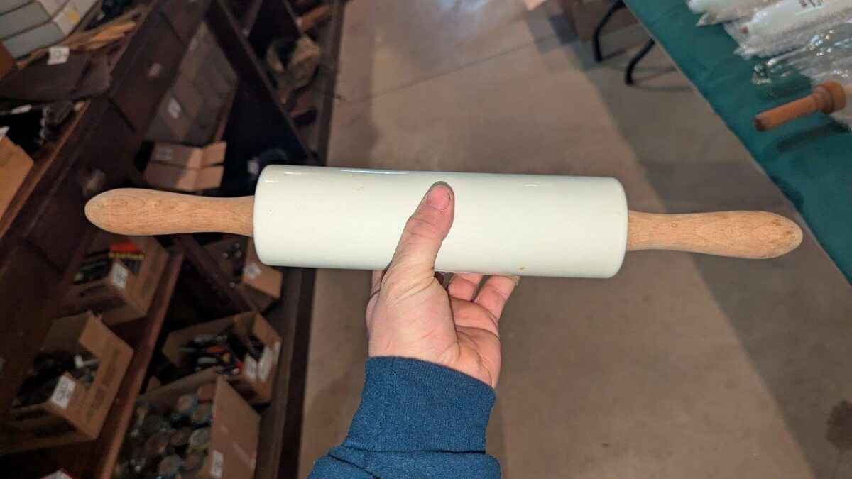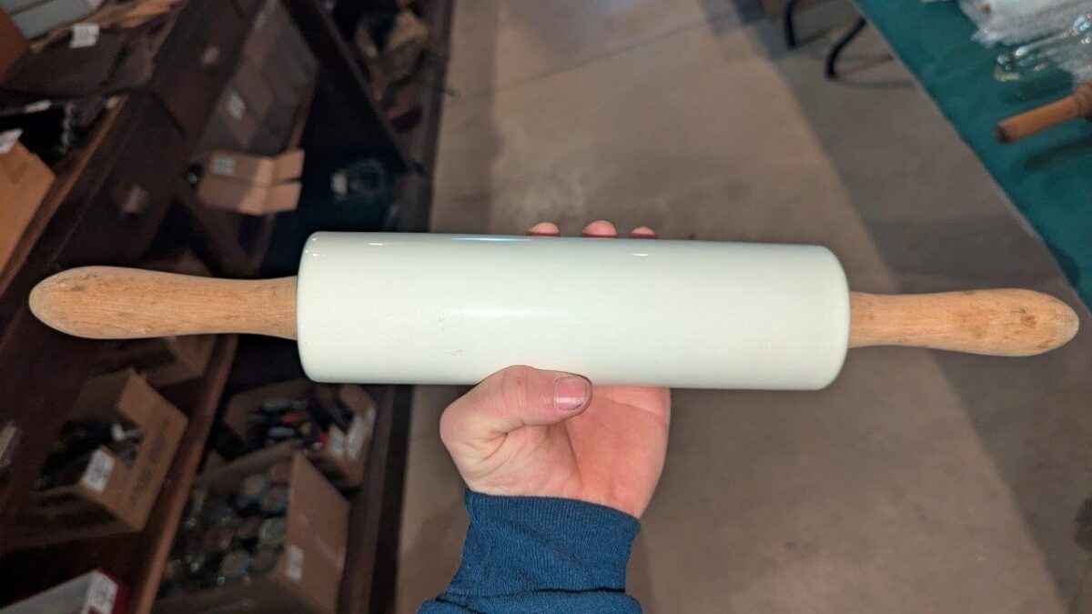 Milk Glass rolling pin with wood handles