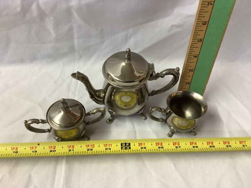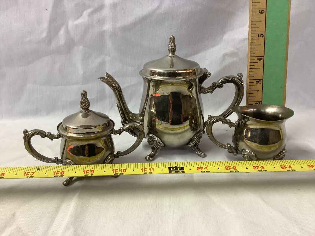 one cup tea pot, cream & sugar silver toned