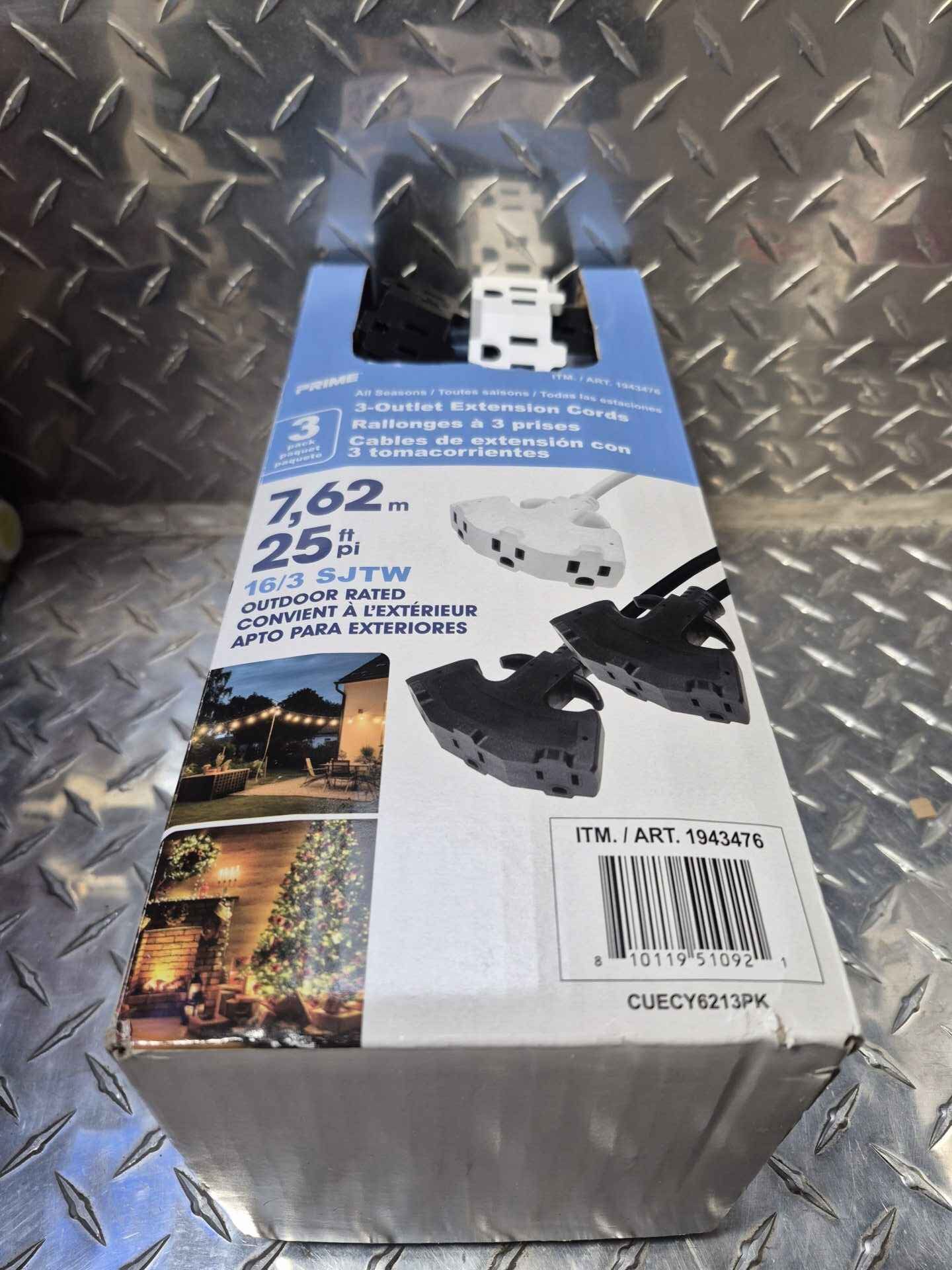 Pack of 3…. 25 foot extension cords with triplex outlets