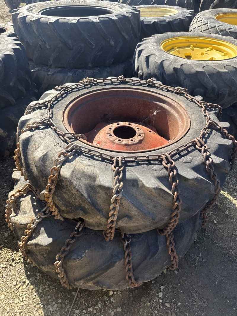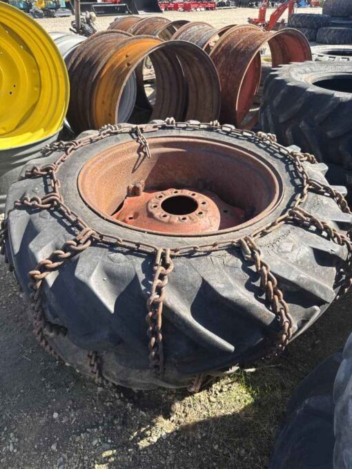 Pair of 14.9 28 tires on case 8 bolt wheels with chains