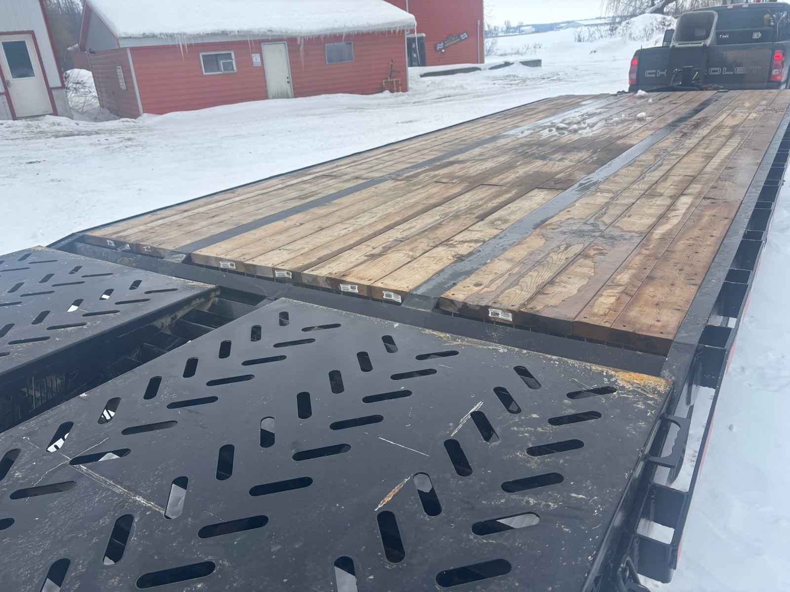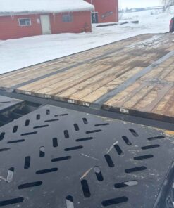 Features: Stake pockets, rub rail, wood deck, and safety chains