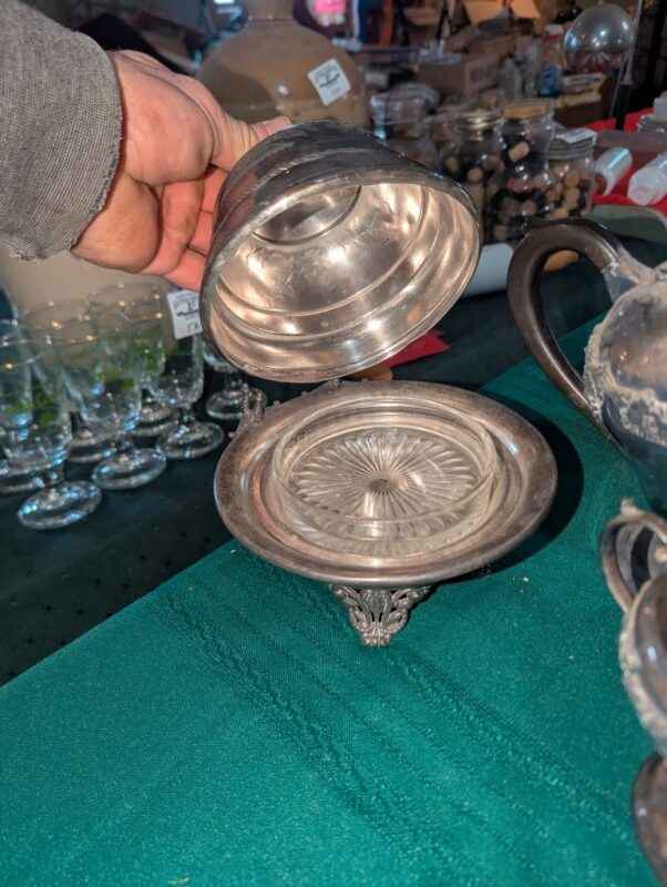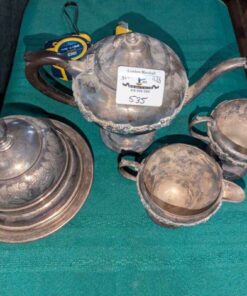 Plated tea pot, cream/sugar and covered serving dish