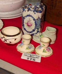 Porcelain candle stick holders, mini vase, covered jar