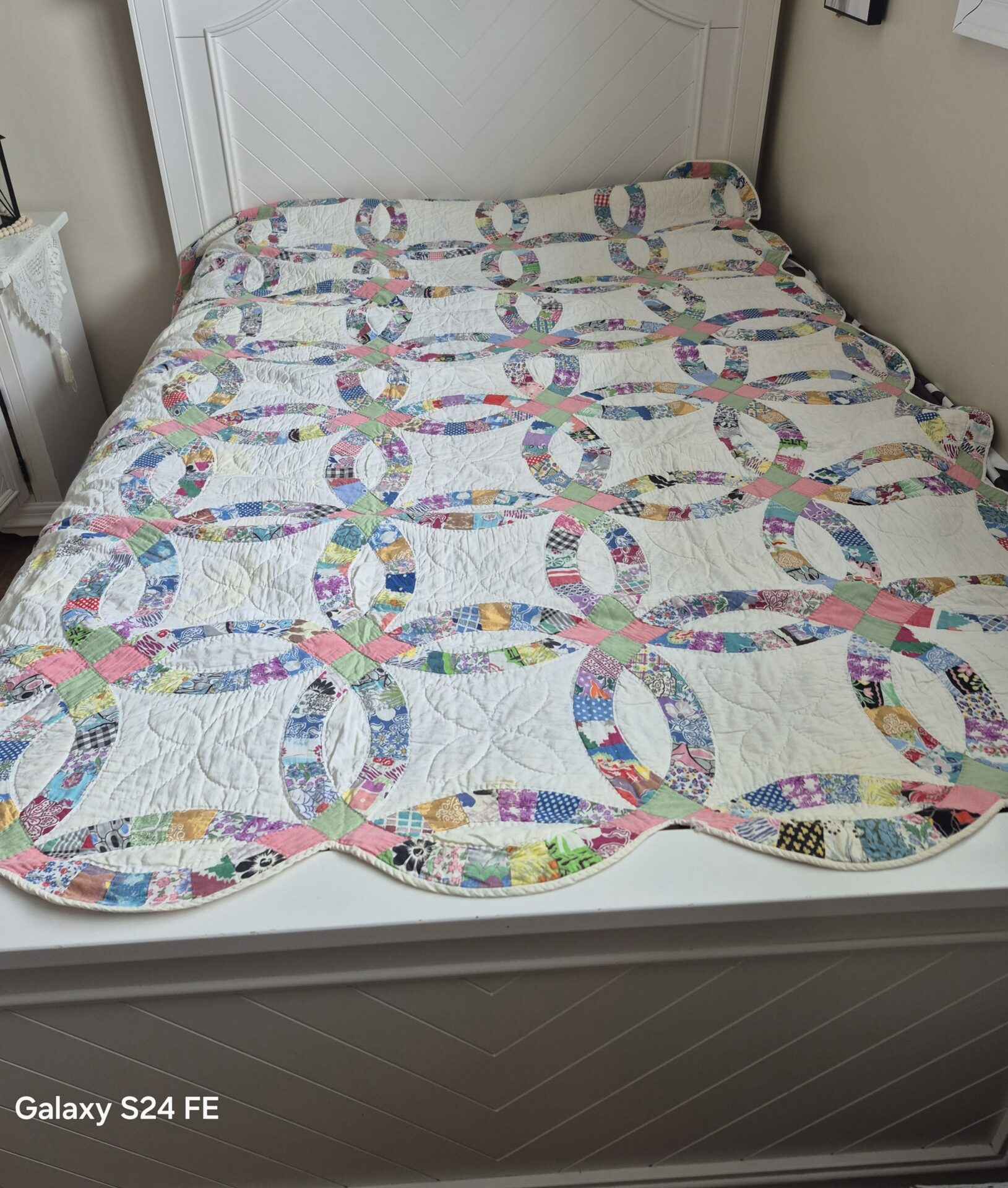Queen sized or larger multi colors with white background patchwork quilt