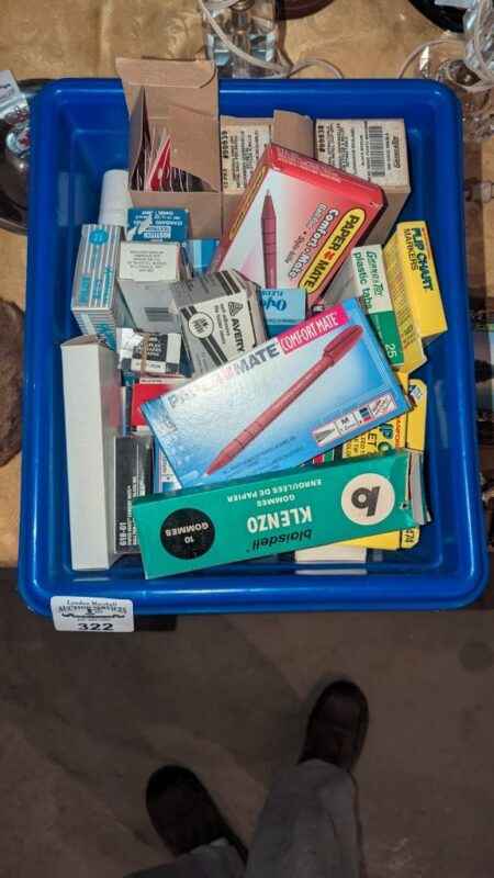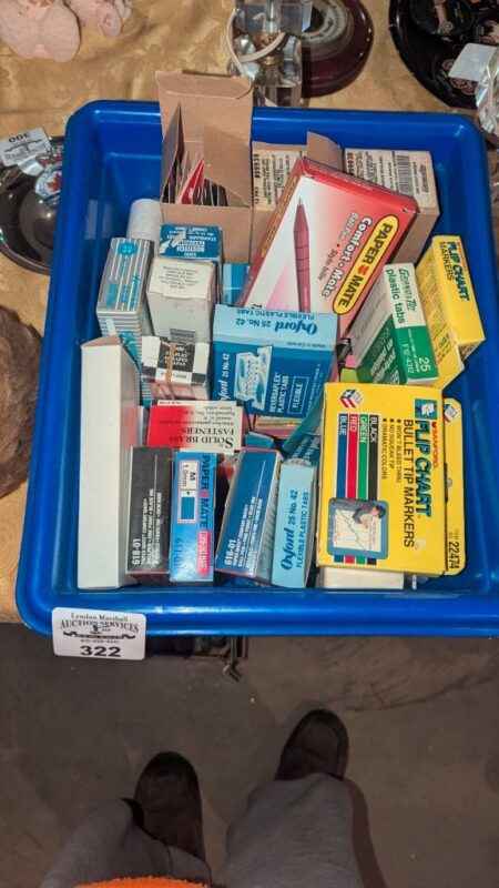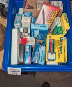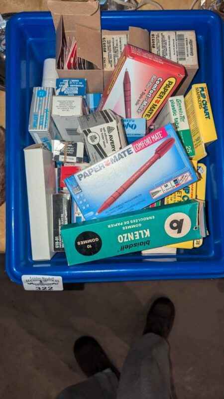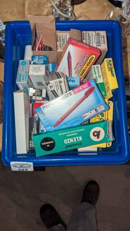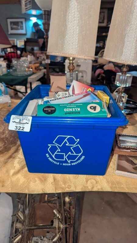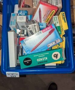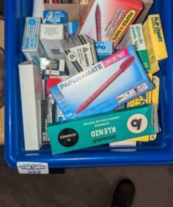 Recycle bin of labels, pens, staples, plastic tabs, etc