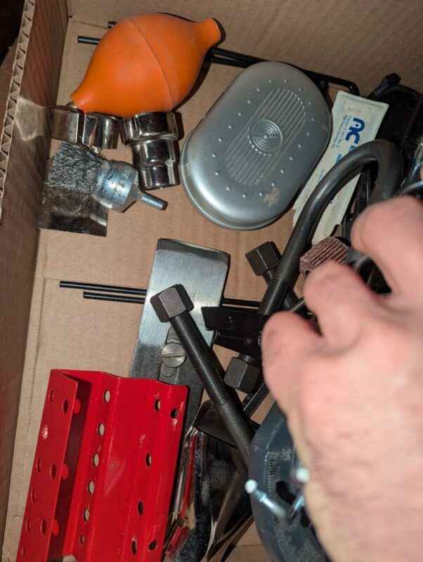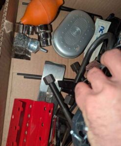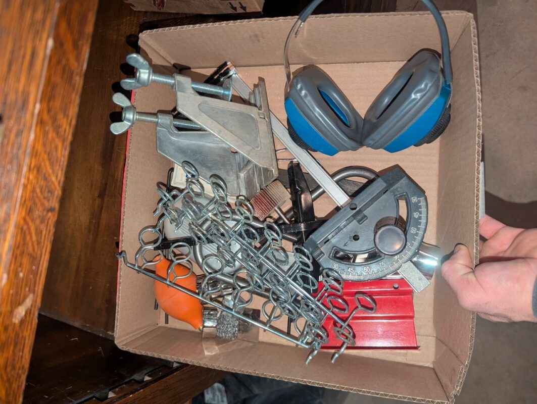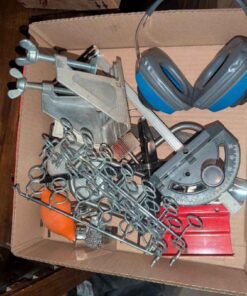 Shop hanger, table saw push guide, ear protection, etc