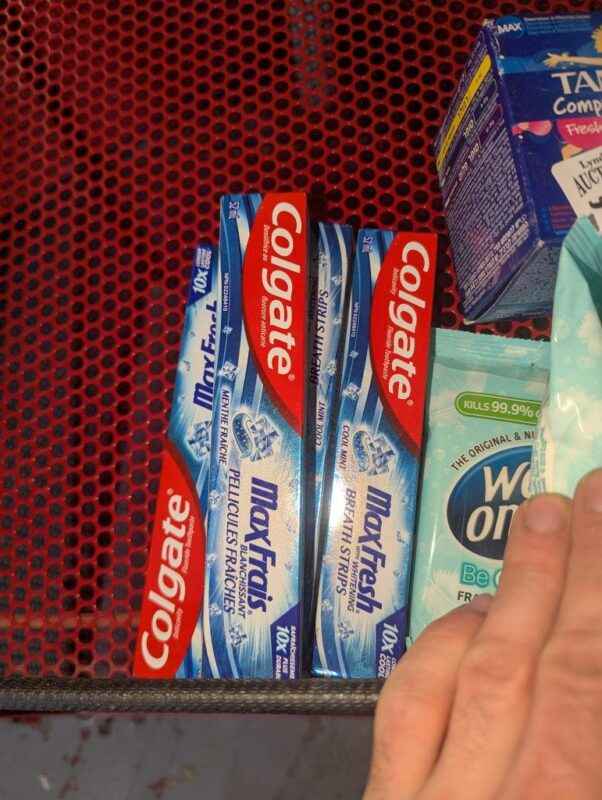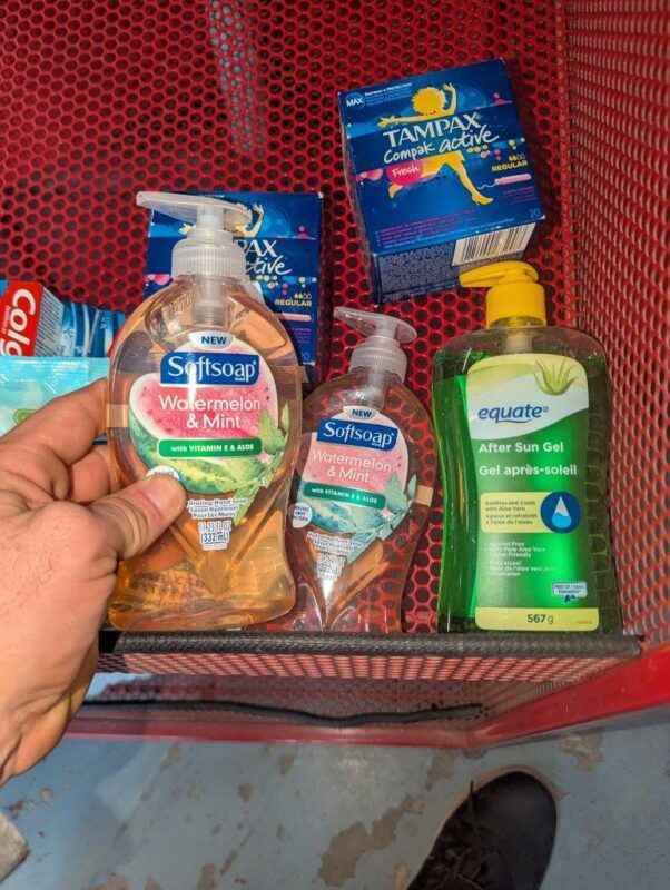 Soap, wetones, toothpaste & tampons