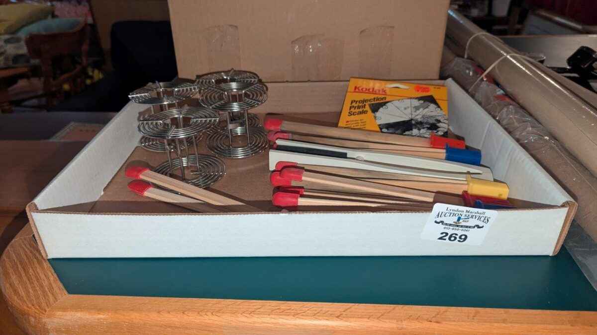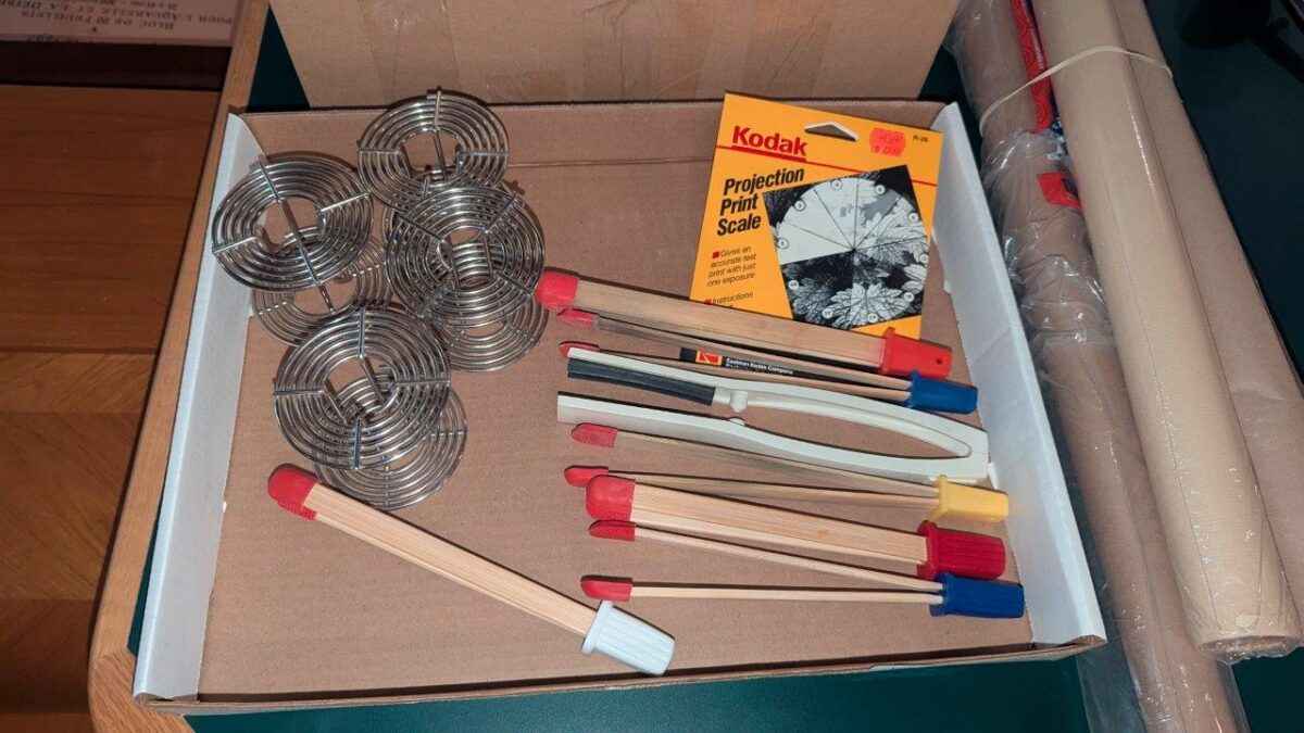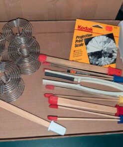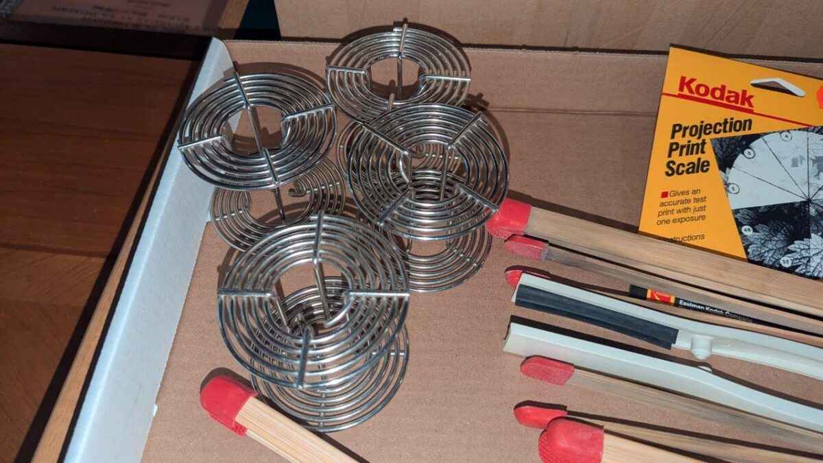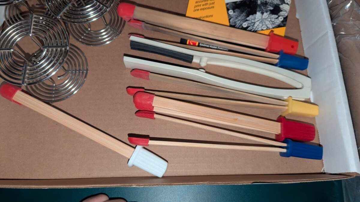 Stainless steel film developing reels, print scale and bamboo tongs, etc