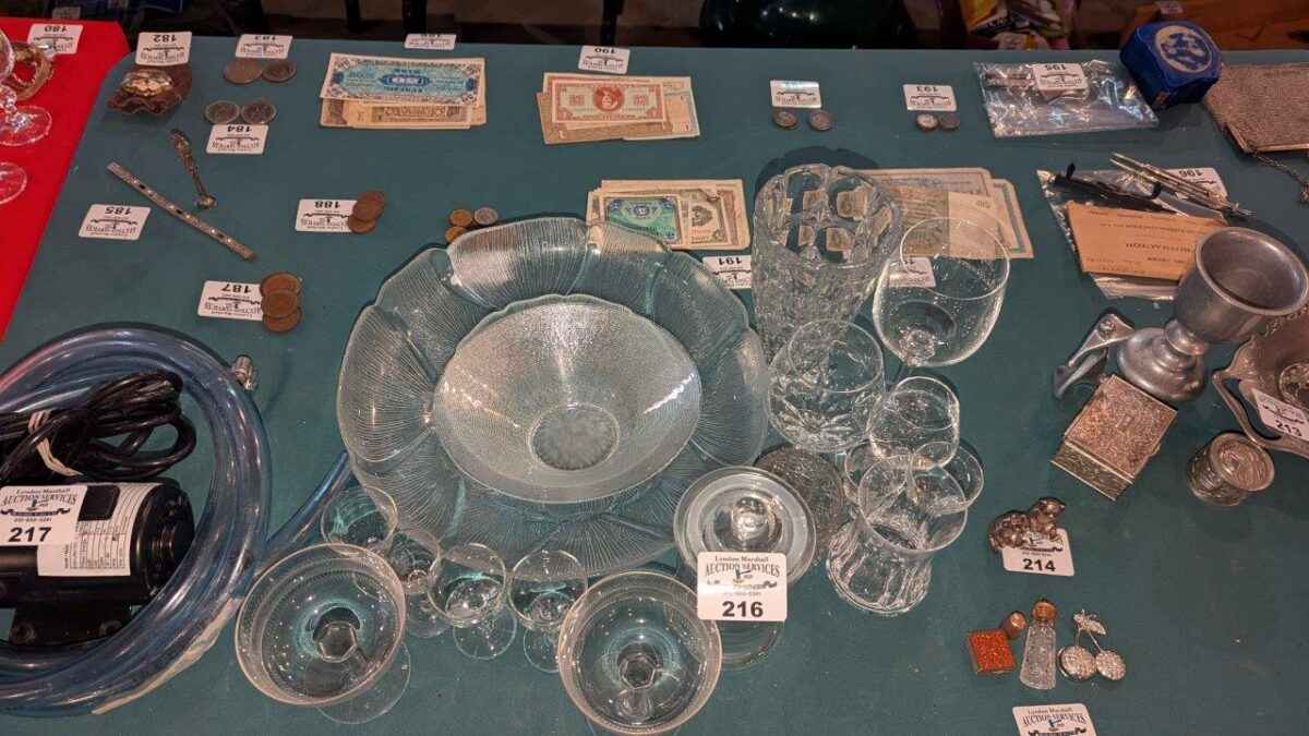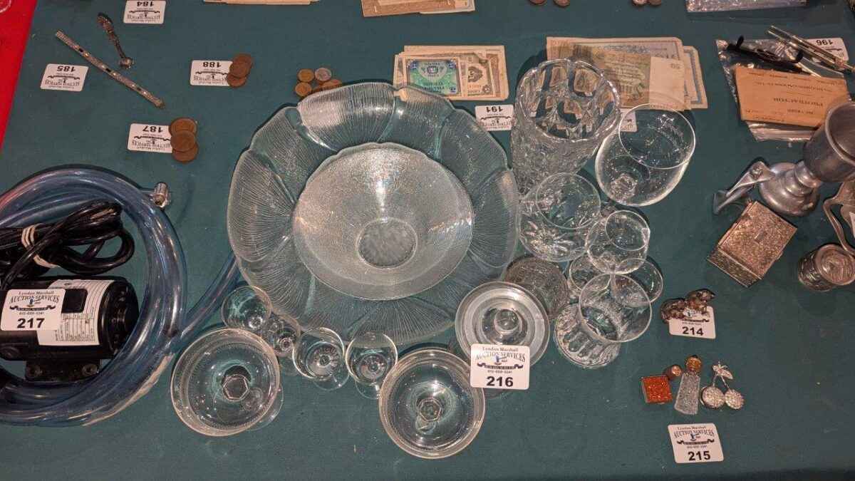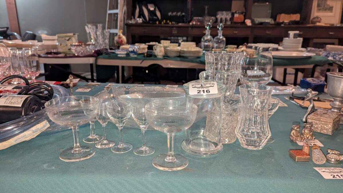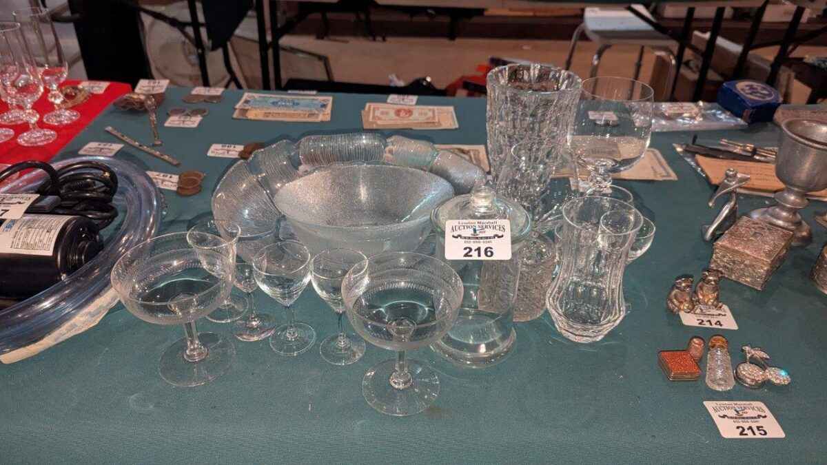 Stemware, covered jar, bowls, etc