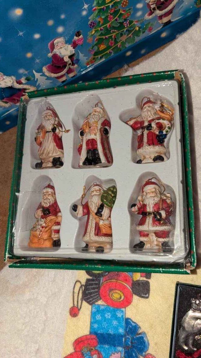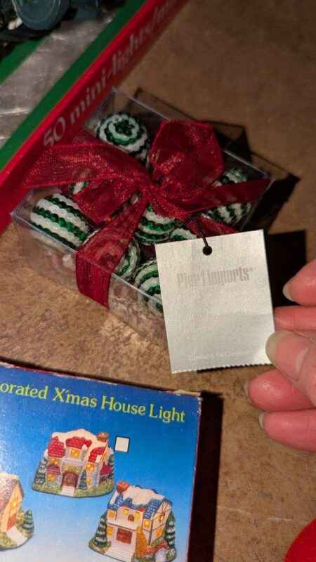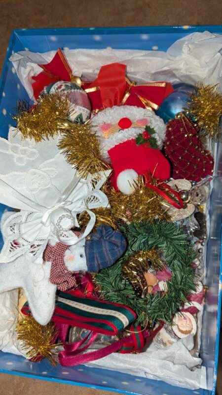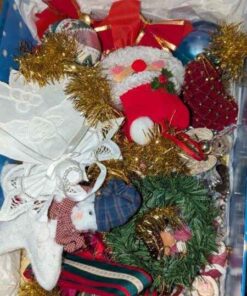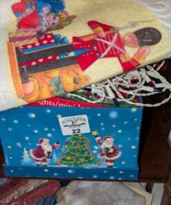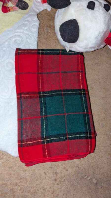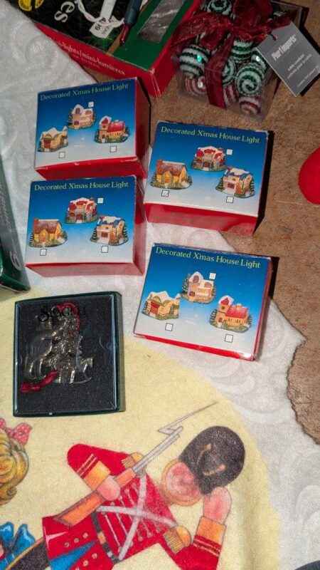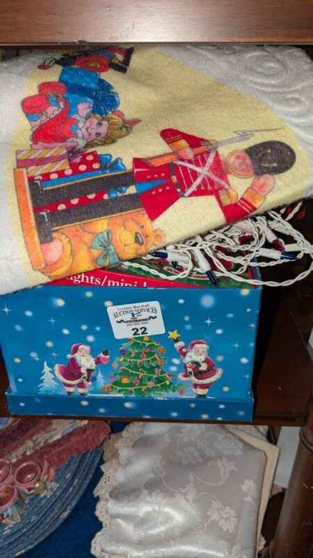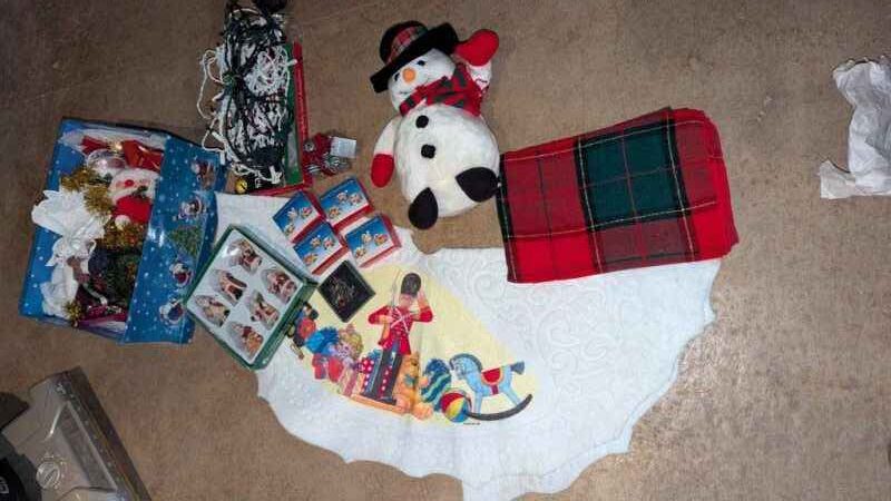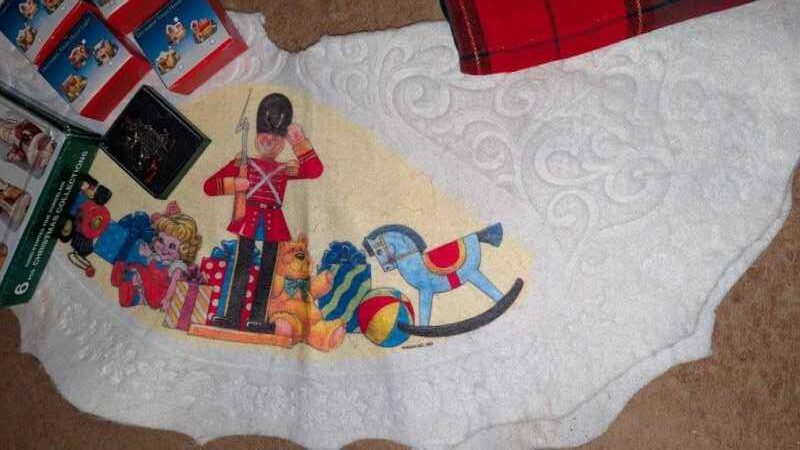 Tablecloth, tree skirt, tree ornaments, mini lights, etc