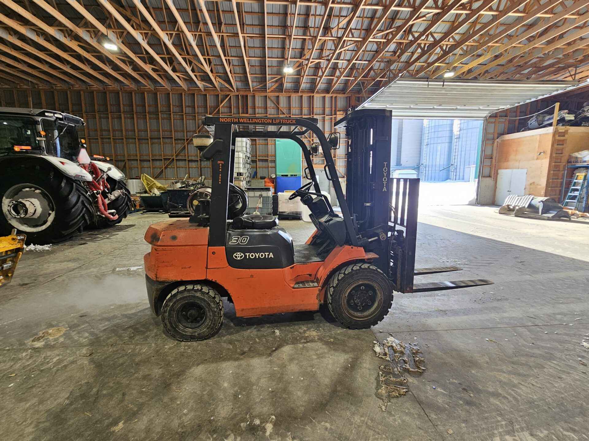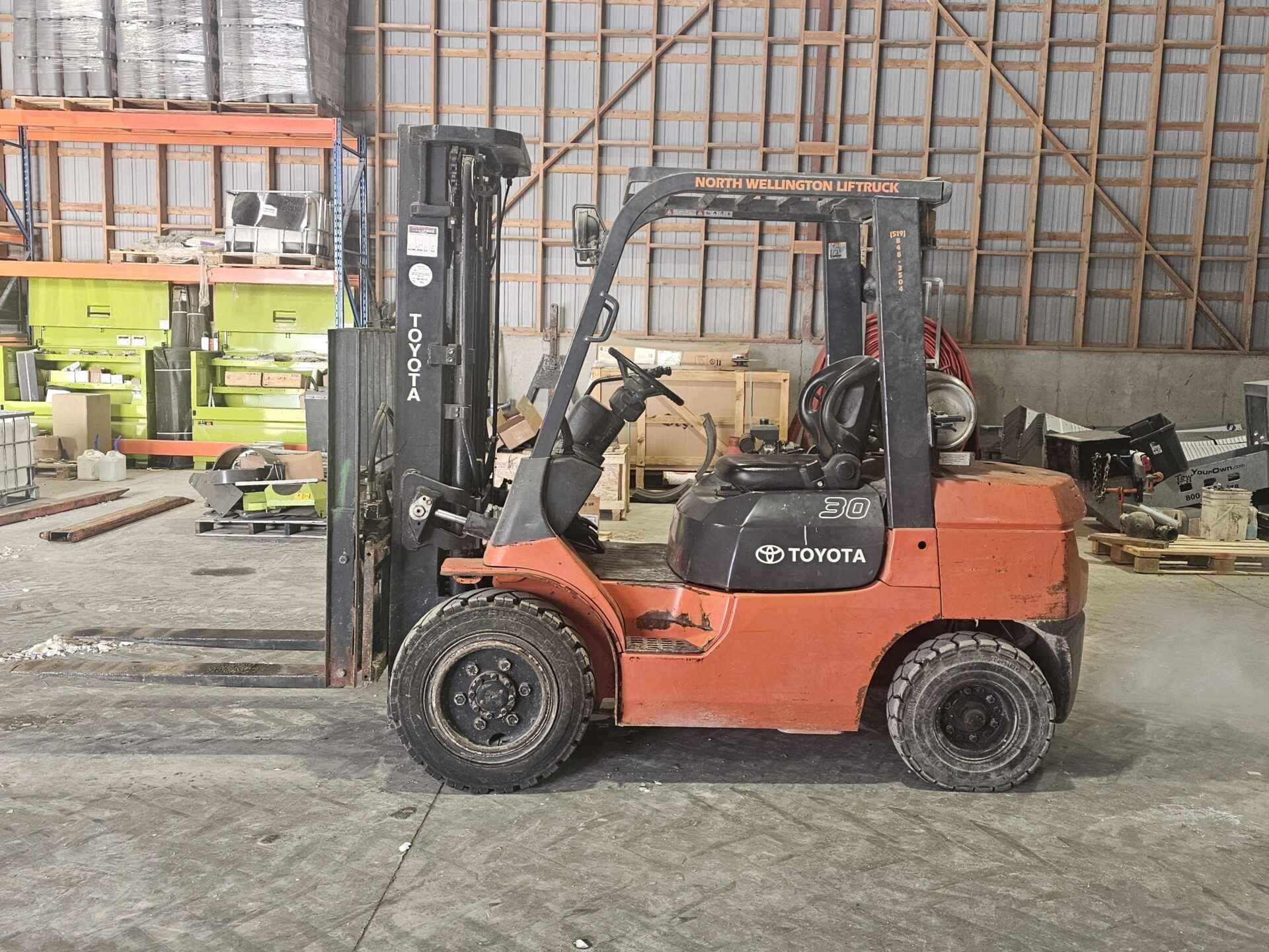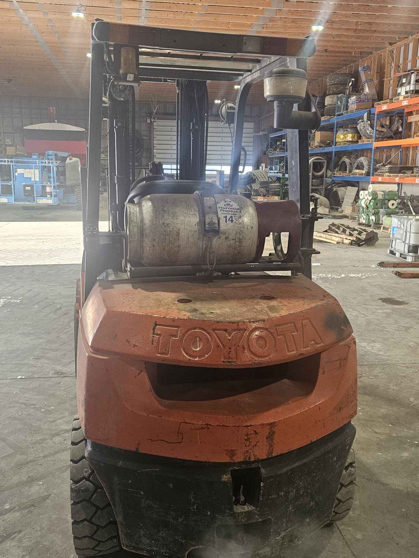 Toyota model GU30 6000lb fork lift. Propane fuel. Side shift and hydraulic fork adjust. Good starting unit and runs well, no known issues. Outdoor tires.