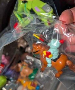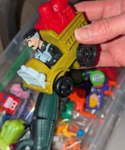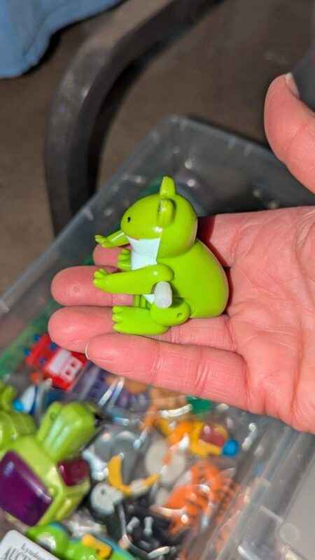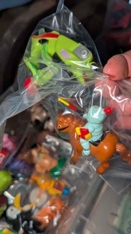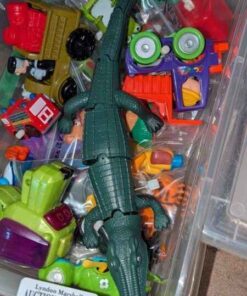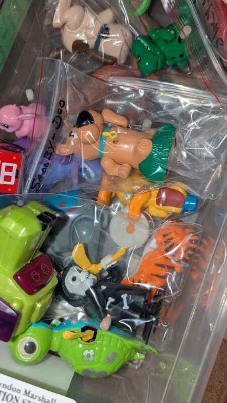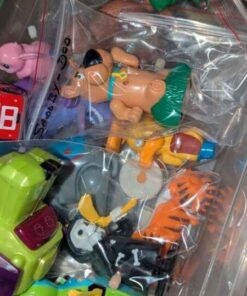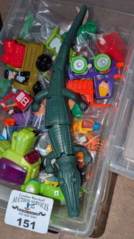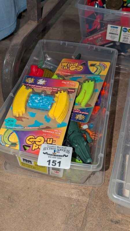 Variety of wind up toys, clear storage box